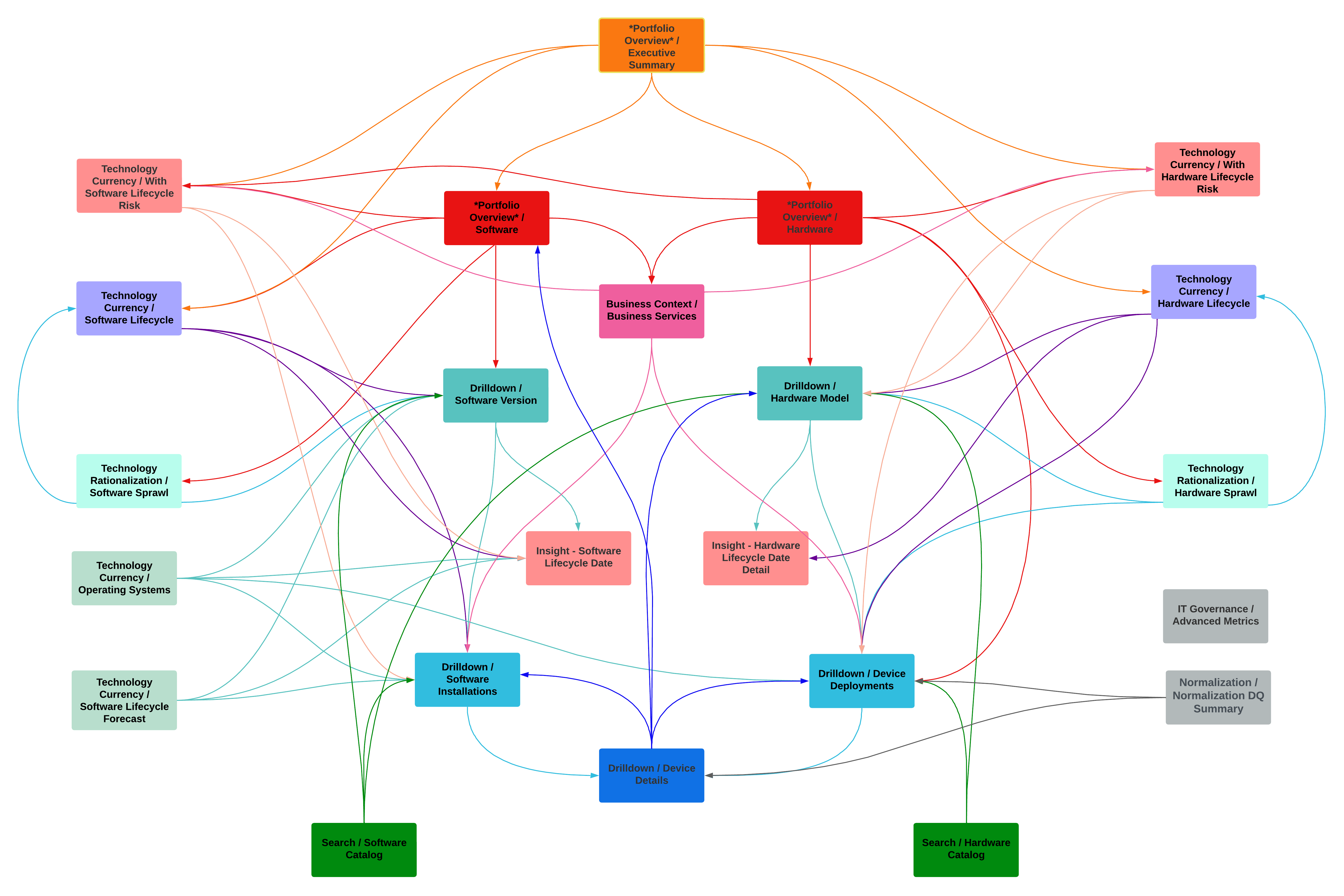 *Portfolio Overview* / Executive SummaryProvides a high level overview of your entire IT estate with tables, charts, and graphs that summarize your hardware portfolio, software portfolio, and show lifecycle/currency by various facets of your technology assets and IT environment including software category, hardware category, device type, business unit, business service, cost center, domain, and location. This dashboard has drill-down links to the following built-in dashboards: Hardware (Portfolio Overview) Hardware with Currency Risk Hardware Lifecycle Software (Portfolio Overview) Software with Currency Risk Software Lifecycle